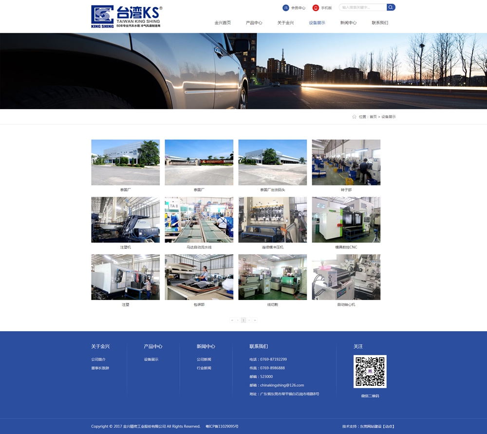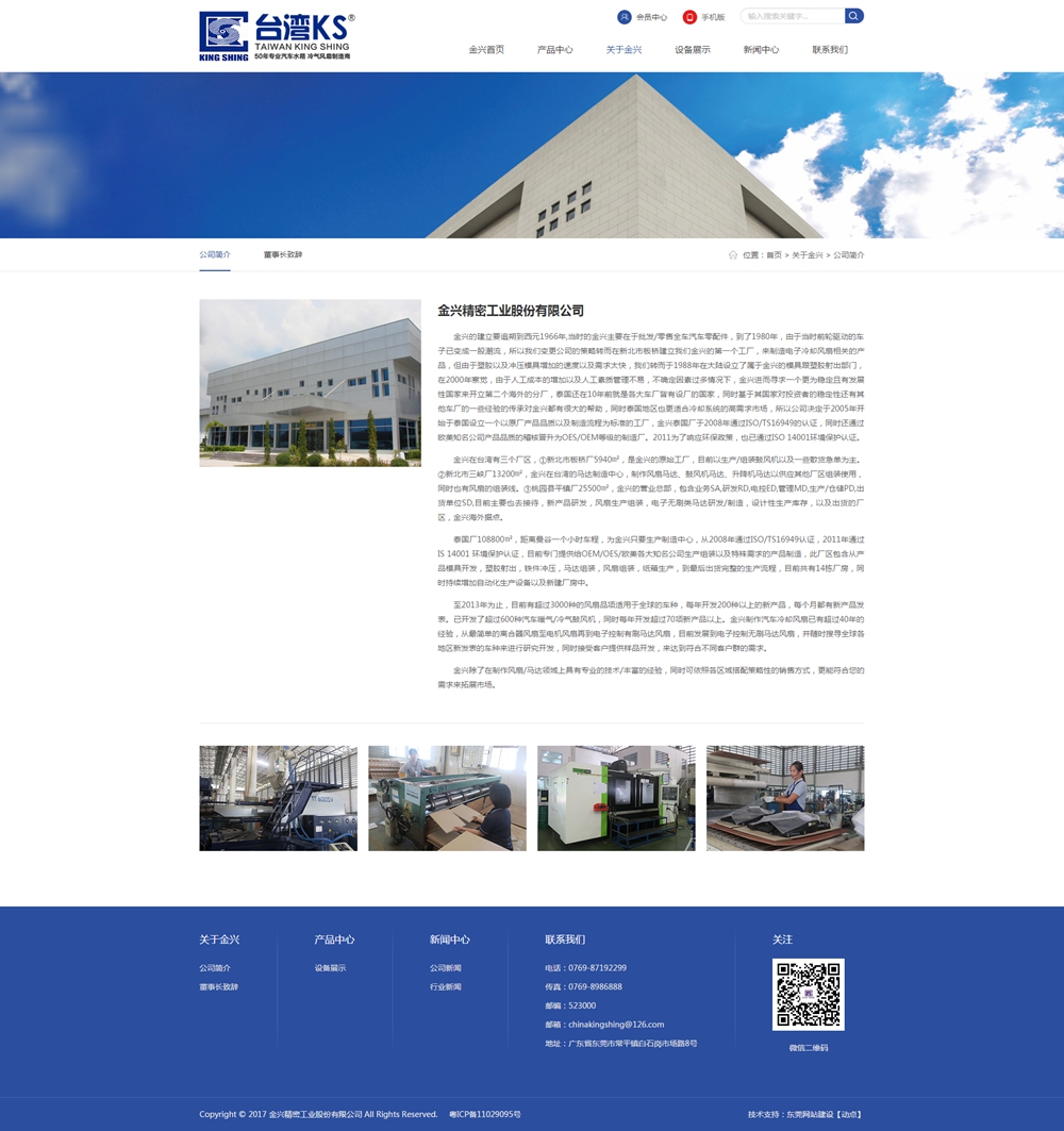 金兴的建立要追朔到西元1966年,当时的金兴主要在于批发/零售全车汽车零配件,到了1980年,由于当时前轮驱动的车子已变成一股潮流,所以我们变更公司的策略转而在新北市板桥建立我们金兴的第一个工厂,来制造电子冷却风扇相关的产品,但由于塑胶以及冲压模具增加的速度以及需求太快,我们转而于1988年在大陆设立了属于金兴的模具跟塑胶射出部门,在2000年察觉,由于人工成本的增加以及人工素质管理不易,不确定因素过多情况下,金兴进而寻求一个更为稳定且有发展性国家来开立第二个海外的分厂,泰国还在10年前就是各大车厂皆有设厂的国家,同时基于其国家对投资者的稳定性还有其他车厂的一些经验的传承对金兴都有很大的帮助,同时泰国地区也更适合冷却系统的高需求市场,所以公司决定于2005年开始于泰国设立一个以原厂产品品质以及制造流程为标准的工厂,金兴泰国厂于2008年通过ISO/TS16949的认证,同时还通过欧美知名公司产品品质的稽核晋升为OES/OEM等级的制造厂。2011为了响应环保政策,也已通过ISO 14001环境保护认证。