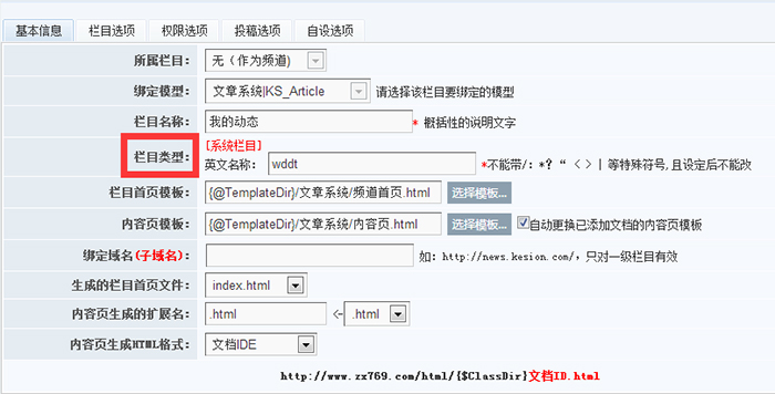 3、栏目类型则是由http://网址/目录名/文件名组成的静态URL网址,点击栏目类型后面的编辑框修改即可。如图2