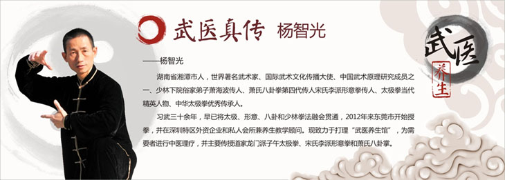 杨智光先生,湖南省湘潭市人,生于一九六七年,自幼受习武,博学多家中华内外家拳术。现武学宗脉承继「卢氏结构」和萧氏八卦掌传人天津靳爱祥先生学习八卦掌、形意拳、太极拳,为「萧氏八卦掌和卢氏结构」艺,在「莞」传人,为追求传统内家拳学宗脉体系,曾远赴行旅河北、江西、新疆、黑龙江十数省,寻师访友,搜集八卦掌、形意拳及太极拳等武学名家史料,交流切磋,增益见闻,启迪后学。