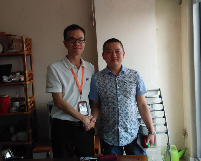 我司梁工(左)亲自接待玉伯乐电子郑总(右)