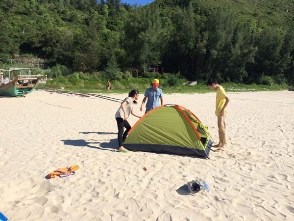 几经辛苦,一个个畸形的帐篷在我们的合作之下搭建而成。大本营建设好之后,我们各自开展了自由活动,捡贝壳、堆沙人、碧波畅泳,各有各的精彩。