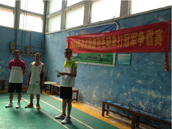 首先这场比赛将由梁总监担任主持人一职,为我们宣布赛事的安排及注意事项,接着由裁判员代表叶广和及运动员代表骆阿林分别上前宣誓,后由我司房总宣布2014年动点网络届羽毛球单打争霸赛正式开始。