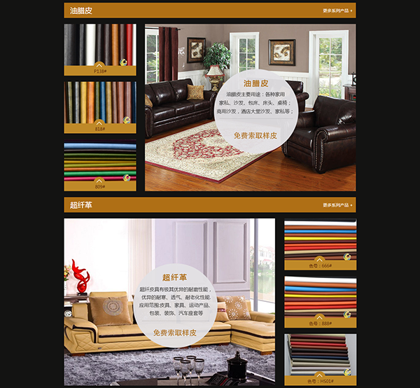将各种皮革种类展示在首页方便用户浏览,每种皮革用一样精美的图片作为成品的介绍,显得大气自然、简洁大方、富有层次感。这种设计能很好的刺激用户的购买欲,即使不购买也会留下本页面继续欣赏其他的产品。