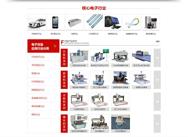 思飞尔公司主要面向:手机周边,电脑周边,汽车电子,LED照明及显示屏、家用电器,连接器及线材 ,安防电子,玩具等行业,为其提供专业的制造解决方案:例如PCB分板机,分板模具,,热压机,焊接机,点胶机,螺丝机,夹治具等。