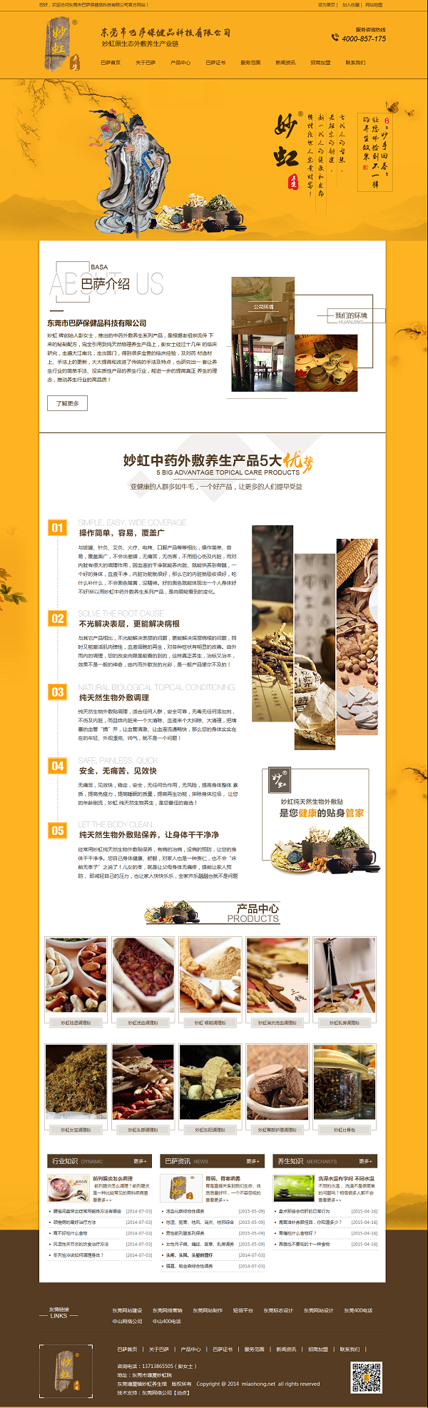 当然,程序开发部分也不容忽视。工程师将代码尽量简化来迎合搜岁引擎的喜好,采用三层div+css框架和目前流行的PHP语言进行开发。巴萨保健品营销型网站主要采用的是黄色风格,用华佗画风的banner来烘托“健康”意识,版面还有许多本草植物进行点缀,强调了巴萨保健品绿色、环保的理念。