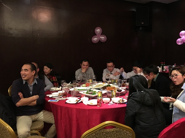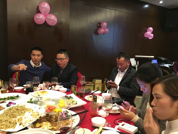 会议结束后,我司邀请参加晚宴的嘉宾也陆续入席,欢快的音乐响起时,随着我们企业文化部叶广和经理独唱的一首经典歌曲《月亮代表我的心》拉开了“2016迎春晚宴”的序幕。话毕,美酒佳肴已经端上桌子,同事们与嘉宾们举杯畅饮,享受美酒佳肴。