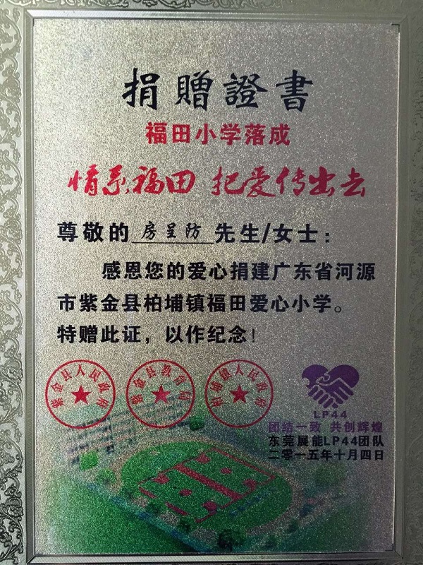 我司房总热心参与由广东东莞展能LP44爱心团队组织的无偿援建紫金柏埔福田小学爱心行动,为给农村孩子一个完善的教学设备以及良好的学习环境略尽绵力。2016年2月25日,东莞展能LP44爱心团队的几位领导莅临我司考察,并赠予我司房总捐赠荣誉证书。