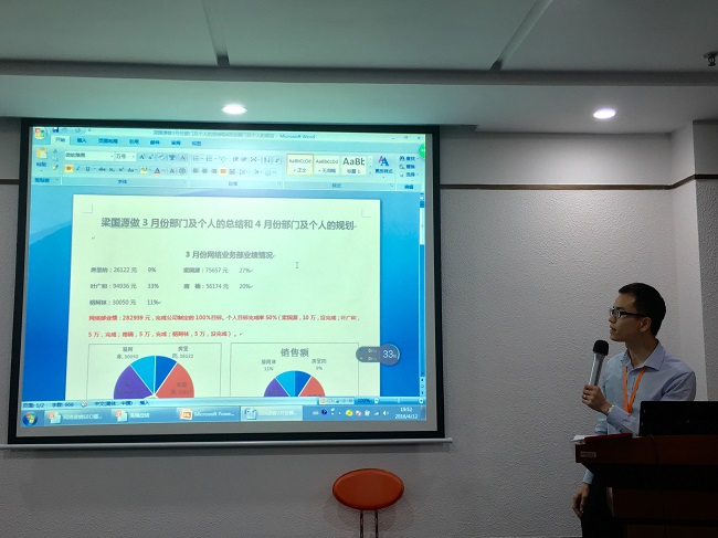 会议由我司房总经理主持。首先对我们网络部的销售叶工进行了表彰。并由叶工为同事们分享成功的经验总结。随后由我司骆工、南楠分别作个人的工作总结以及4月份的工作规划。后由我司网络部的梁总监为我们网络部进行了总结报告。梁总监在报告中肯定了同事们取得成绩的同时,也指出了在过去的一个月中所存在的不足和有待改进之处,并指出坚持以客户为中心,这是我们一切工作的指导方针。鼓励同事们以奋斗者的精神去迎接4月份的工作。