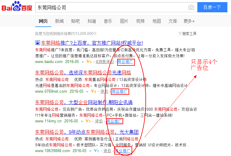 5月23日下午24日,百度搜索推广的首页左侧推广位减为4个,右侧则没有了推广位,百度沿用了10来年的“推广”字样变成了“商业推广”。