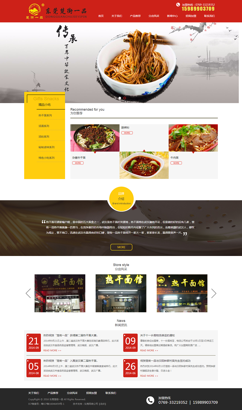 楚街一品,从网站签约到网站建设完成,一直信赖着我司动点网络,双方一直保持着良好的沟通交流合作关系。网站首页,尽显美食诱惑,热干面、特色小吃、秘制卤味等一一清晰的展示在访客面前,自然而然的勾起了人们对美食的向往。分店以滚动的方式展示,容易抓住客户的眼球,使得他们在了解美食的同时又能选择合适的店面。网页前部大图风格古典优雅,衬托出“楚街一品”品牌历史悠远。“一碗热干面、浓浓故乡情”是否又勾起千万游子恋家的心呢。来吧,“楚街一品”东莞总代理就是你的。