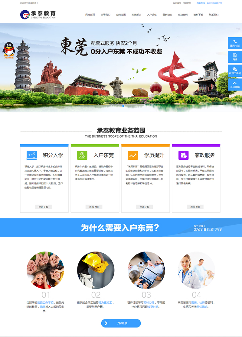 承泰教育网站在版面设计上精美、大气,首页内容丰富,栏目结构直观清晰。在首页排布上直接展示了承泰教育的业务范畴和优势、入户东莞的优势、成功案例、办理流程等等,帮助访客直接了当的了解相应业务,体验流程化服务。网站左边的QQ在线咨询以及右边的服务电话等内容,可以帮助客户直接建立与承泰教育咨询,时间帮助承泰教育了解客户的需求建立联系。