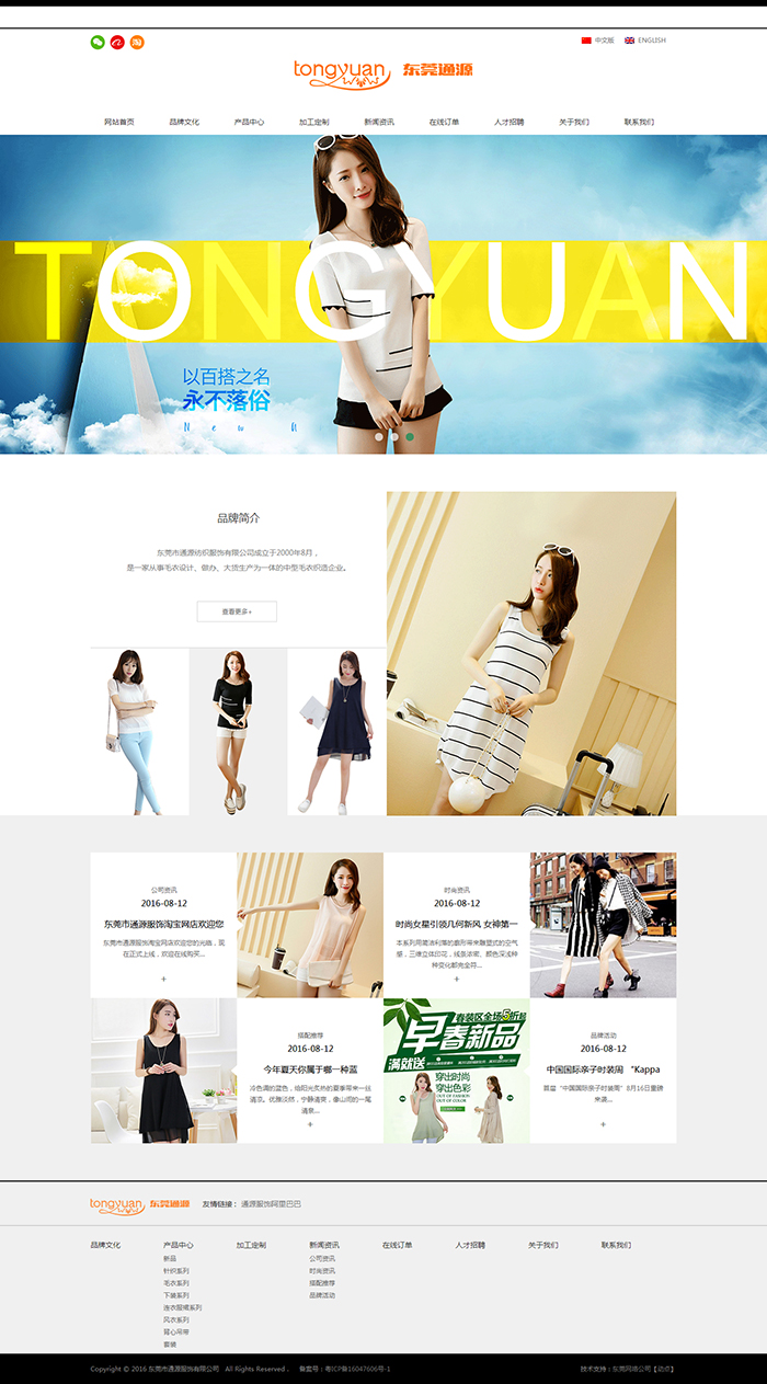 通源服饰在版面设计上,结合客户自身优质百搭的服装产品,时尚百搭之风席卷整个网站。首先当游客点开通源服饰的官网之时,首页那张“以百搭之名、永不落俗”的大图,便足够吸引游客的眼球。接着再往下浏览之时,品牌简介、公司资讯等混合在风格不同、时尚百搭的服装模特儿上,在表达公司品牌元素的同时,更诠释了通源服饰服装产品。