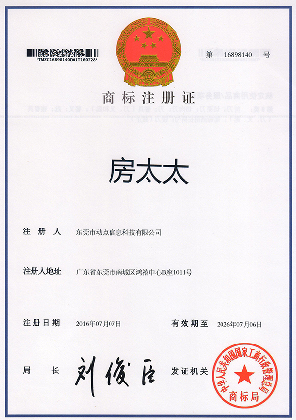 【动点网络 讯】恭喜我司动点网络商标【房太太】经过国家商标局的认证许可,并通过受理、初审、公审等一些列法律程序,并终顺利取得的正式商标,标志着我司动点网络商标品牌战略再次向前。