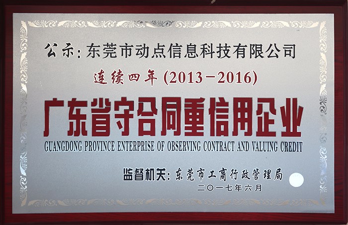 近日,我司动点网络凭借多年来的诚信经营和良好的合同履约能力,顺利通过广东省工商行政管理局的专项考察评选。连续四年获此殊荣,是政府职能部门、社会各界对我司长期以来恪守诚信经营的高度认同和激励。未来,我司动点网络将继续加强企业信用管理体系建设,发挥企业整体实力和品牌优势,传递诚信正能量,为促进社会诚信体系建设作出新的贡献。