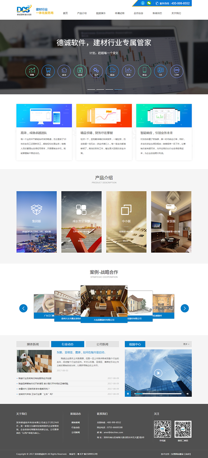 我司动点网络为德诚软件设计建设的企业网站很好的结合了客户需求、行业特性以及德诚软件的vi,在页面设计过程中运用了logo的配色并且结合内容去设计,网站的布局规划清晰、方正,视觉整体简洁、大气,给用户以清新、舒适的感觉,贴合软件科技公司的特性,也能展示公司雄厚实力。