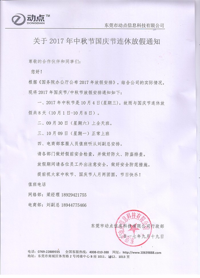 根据《国务院办公厅公布2017年放假安排》,结合公司的实际情况,现将2017年国庆节/中秋节放假安排通知如下: