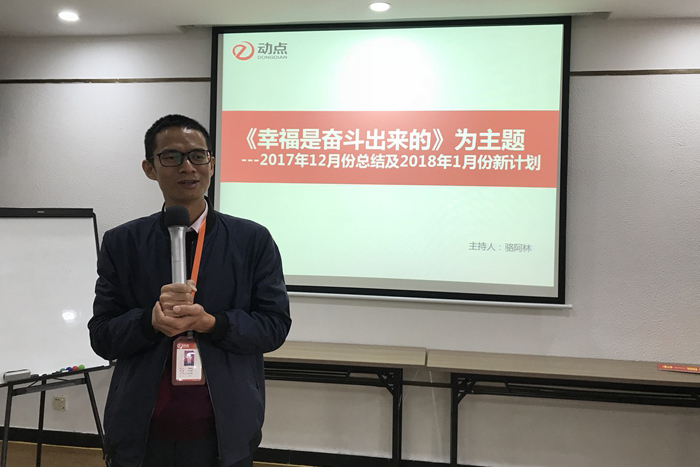 【动点 讯】2018年1月6日星期六早上,我司动点参会同事在会议中心召开了2017年12月份总结及2018年1月份新计划会议。会议由主持人骆阿林拉开序幕,动点总经理房呈防会议致辞。东莞网站建设