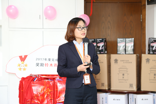 接着颁发了2017年度完成目标奖,由网络部南楠经理、骆阿林经理获得,奖励铃木雨燕汽车一台!