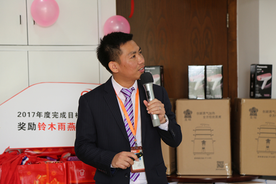 梁国源总监为获得2017年度完成目标奖的南楠经理颁奖