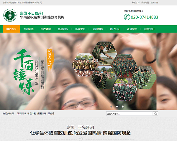 广州市学邦教育信息咨询有限公司是经广州市白云区人民武装部、中国人民解放军广州市警备区司令部、中国人民解放军广东省军区审批的承担学生军事技能训练的单位,军训基地有:广东省国防教育基地、广州市白云区国防教育基地(白云区人民武装部)、从化基地、黄埔基地。基地环境优美、空气怡人、交通便利,场地封闭。占地有5.5万平方的露天军训场地;有1万多平米的室内训练场地,有独立的实弹射击场;配备训练有素的专业军事教员,我基地每次可接纳2500人进行军事训练,住宿床位、学生食堂、课室、多媒体等,基地设施一应俱全。