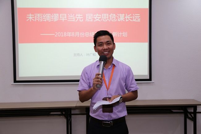 热烈的掌声送走了两位冠军,接下来是网络部骆主管、叶经理、南经理分别做2018年8月份总结以及9月份新计划,梁总监、房总对以上同事点评。