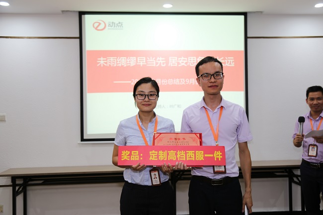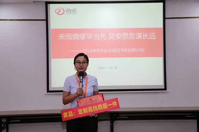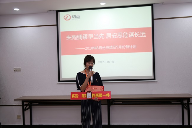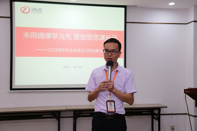 【动点网络 讯】2018年9月5日晚,动点网络在会议中心举行了8月份总结表彰及9月份新计划部署会议。本次会议由动点网络部的叶广和经理主持,会议中各部门对8月份的工作进行了总结,并就9月份公司的各项工作进行安排和部署,同时对公司8月份网络部与电商部的销售情况进行表彰并颁发荣誉证书和奖品。主持人叶经理用他饱含热情的语调围绕会议主题《未雨绸缪早当先,居安思危谋长远》为晚会讲述了一段精彩的开场白。