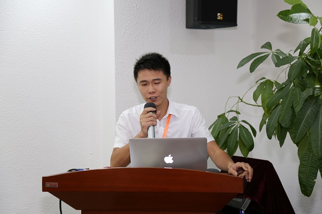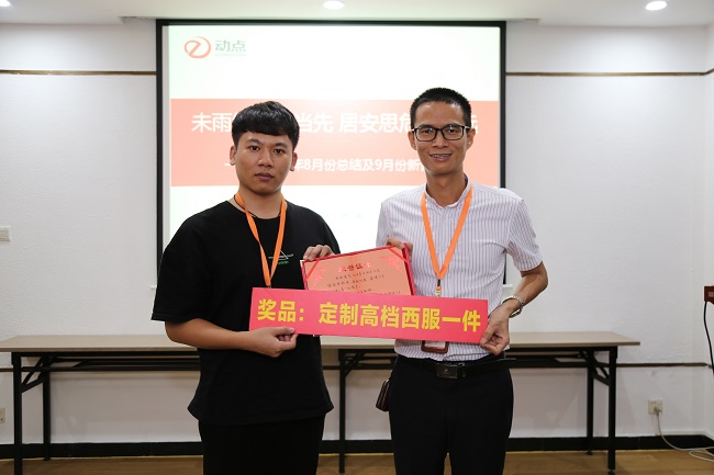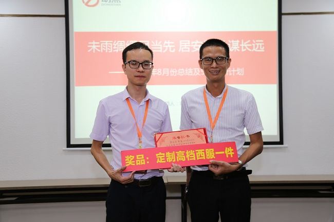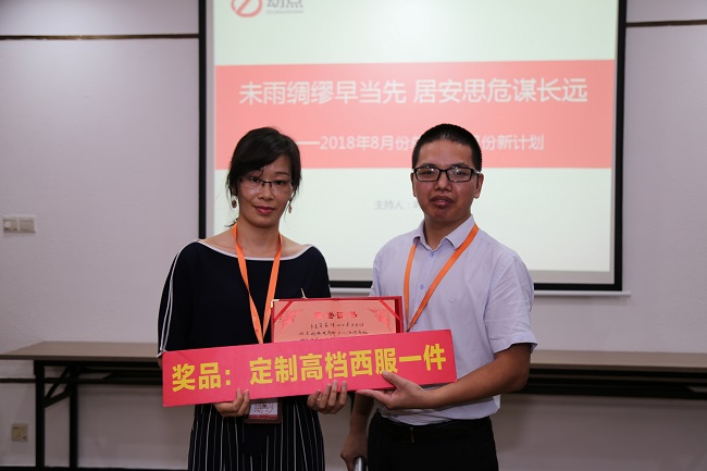 接下来是电商部的主场,首先是对获得2018年8月电商部销售冠军的电商专员韦工颁进行表彰,由电商部刘副总为其颁发荣誉证书及奖品。