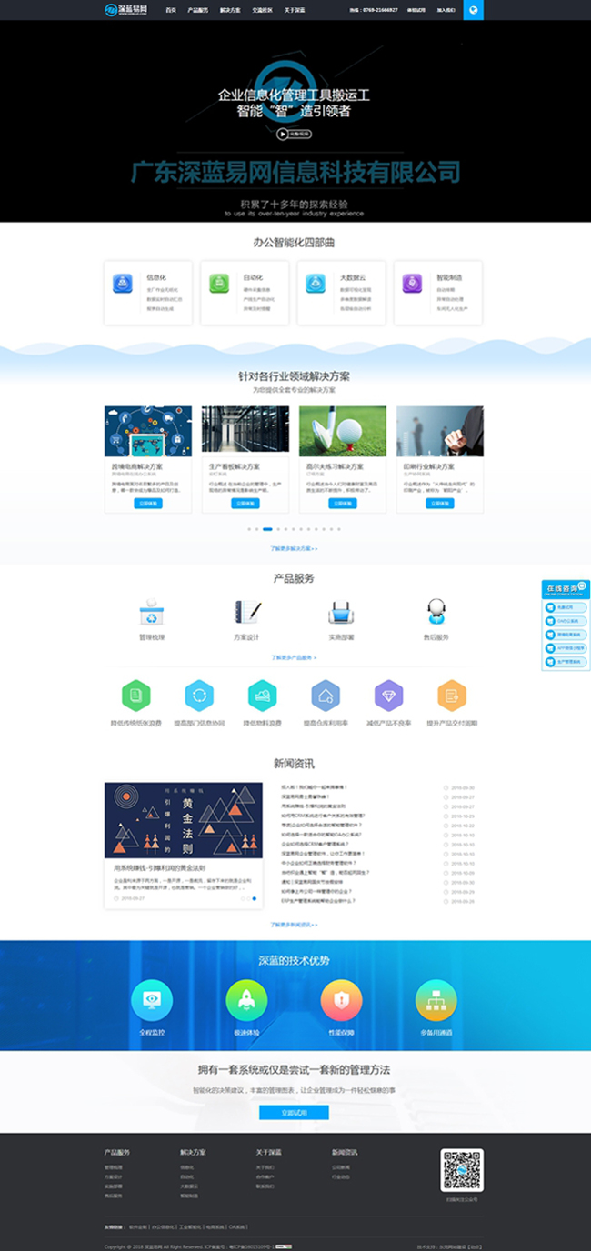 广东深蓝易网信息科技有限公司,是一家在软件定制、办公信息化、工业智能化、电商系统、OA系统上尤为专业的企业。在网站建设过程中,我司与广东深蓝易网信息科技有限公司一直保持着良好的沟通,网站的建设效果也得到客户的高度认可。愿广东深蓝易网信息科技有限公司通过官方网站能得到更好的宣传效果,事业更上一层楼。