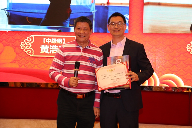 嘉宾(图左)为动点第一届乒乓球中级组冠军黄浩球(图右)颁奖
