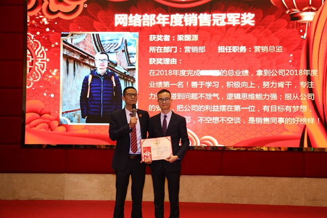 房总(图左)为梁国源(图右)颁发网络部年度销售冠军奖