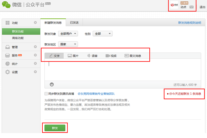 图二1-2 服务号群发消息