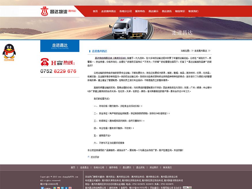 昌达物流有限公司(惠州分公司)始建于一九九四年,在十多年的运输过程中积累了丰富的运输经验,公司在“诚信天下、质量、安全快捷、价格市场化、合理化”的服务宗旨和以“不求大,只求精”的经营理念指导下,打造了“昌达运输服务品牌”的新起点!