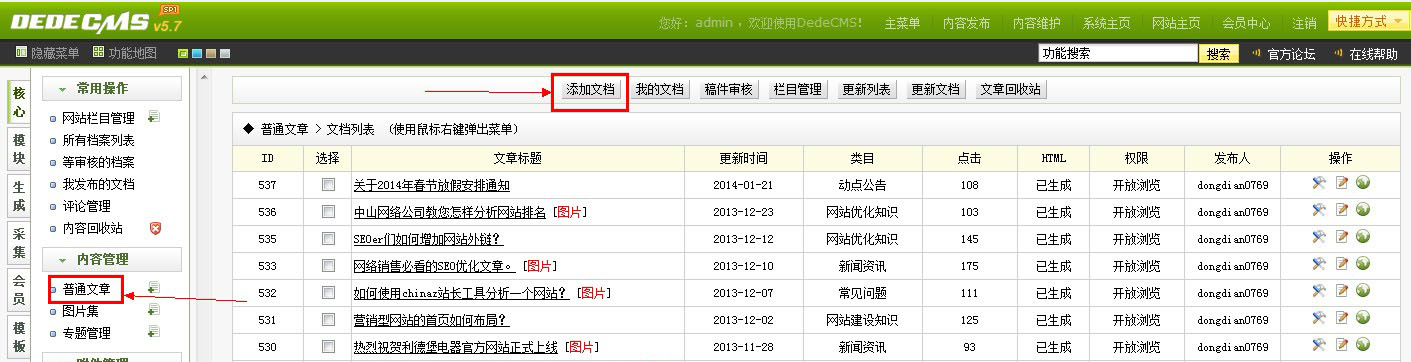 答:在后台的左侧菜单栏找到【普通文章】 -> 【添加文档】.