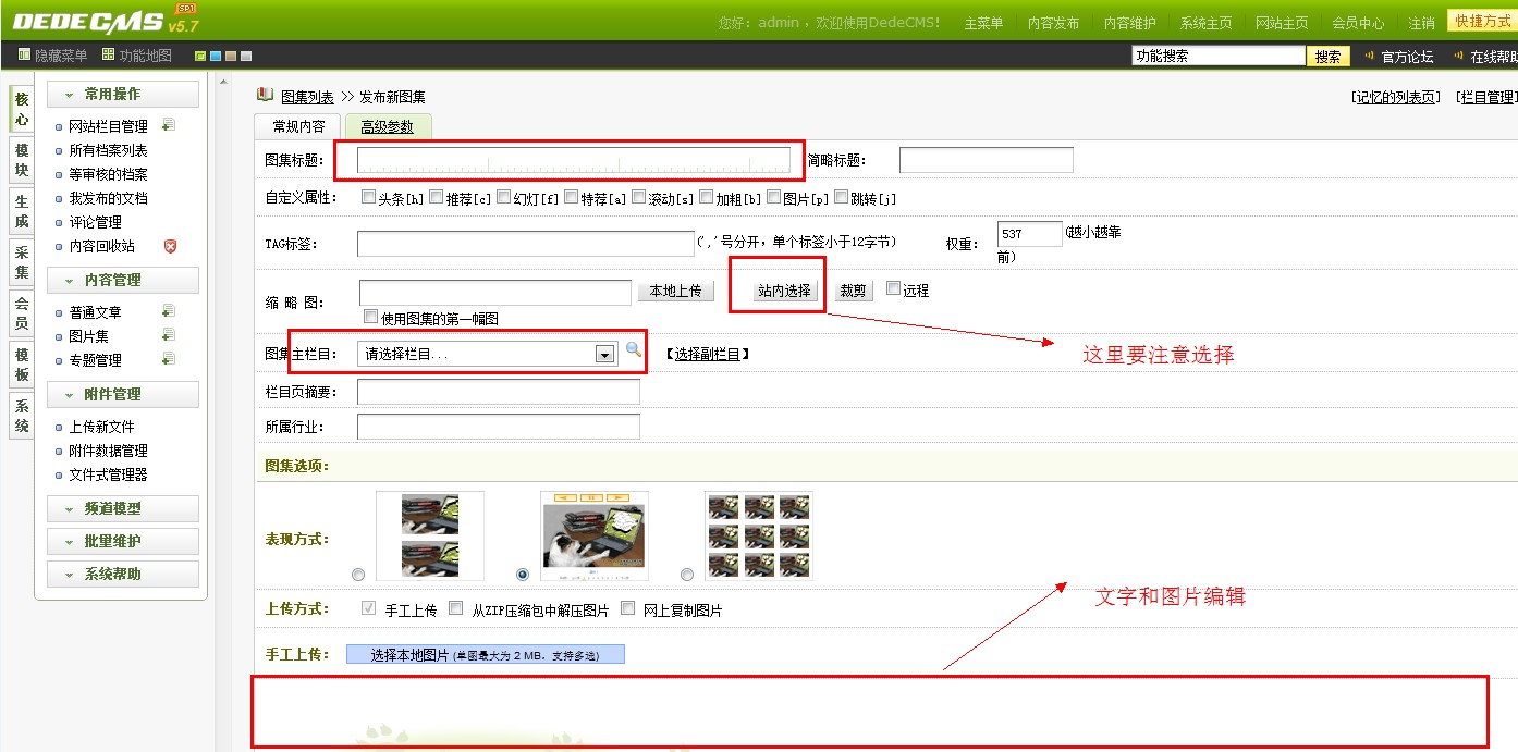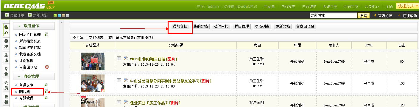 答:在后台的左侧菜单栏找到【图片集】 -> 【添加文档】 -> 【站内选择】
