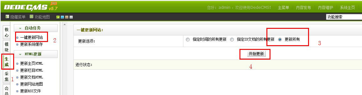答:因为后台使用PHP语言开发,而前台显示需要HTML语言,因此需要在左侧菜单栏中找到【生成】 -> 【一键更新网站】 -> 【更新所有】或者栏目、内容页即可。
