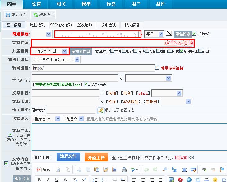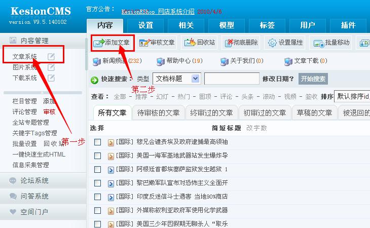 步骤为:文章系统→→添加文章→→填写标题、归属栏目、还有内容→→确定保存。(如图3-1、3-2)