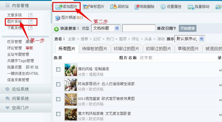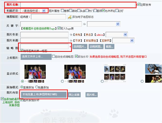 步骤为:图片系统→→添加图片→→填写图片集名称、归属栏目→→上传图片(缩略图不填则默认使用张图片)→→确定保存。(如图 4-1、4-2)