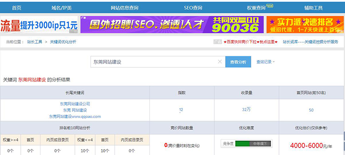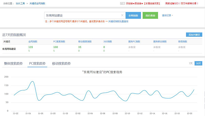 先从查看网站的核心关键词开始,关键词在百度中是否有指数,如果没有指数,百度的搜索结果也比较低,那么此类关键词就没有什么优化的价值。这里以“东莞网站建设”为例。