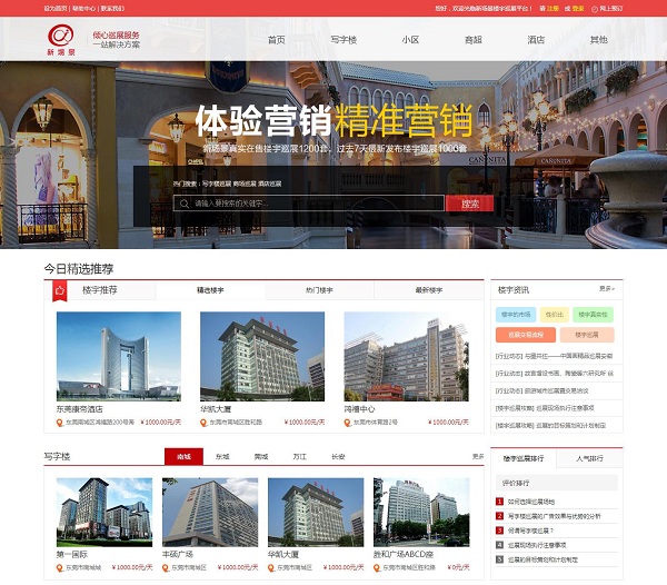 版面设计:新场景营销型网站采用白色为主调,简洁大方。用了大量的版面介绍产品(楼宇),使人对产品一目了然。分类合理,按种类、按地域进行分类,方便客户选择。从网站SEO优化的角度来说,该网站严格遵循了站内优化原则,权重分配合理、链接索引清晰。